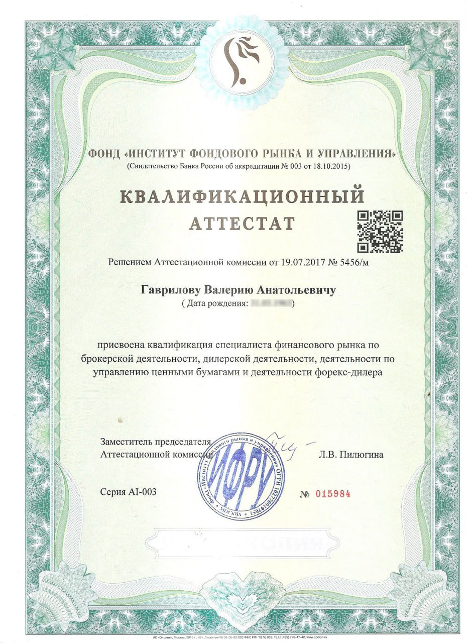 Аттестованный специалист, сертификат ФСФР 1.0